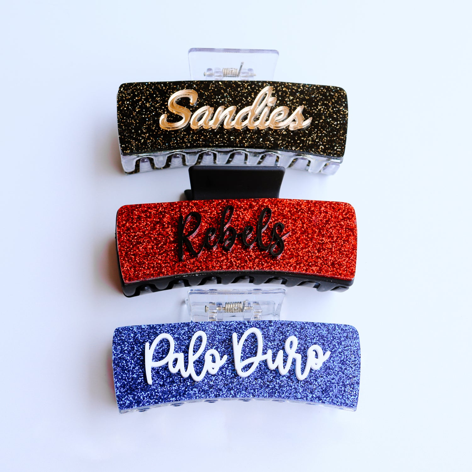 Show off your school spirit in style. Our custom claw clips are the perfect way to rep your team. Designed to hold strong and look cute, each clip can be personalized with any school name or colors. Your school pride deserves to shine. Whether you're cheering in the stands, heading to class, or just want a fun way to show where you belong, these clips are a must-have accessory for every student, athlete, and fan.