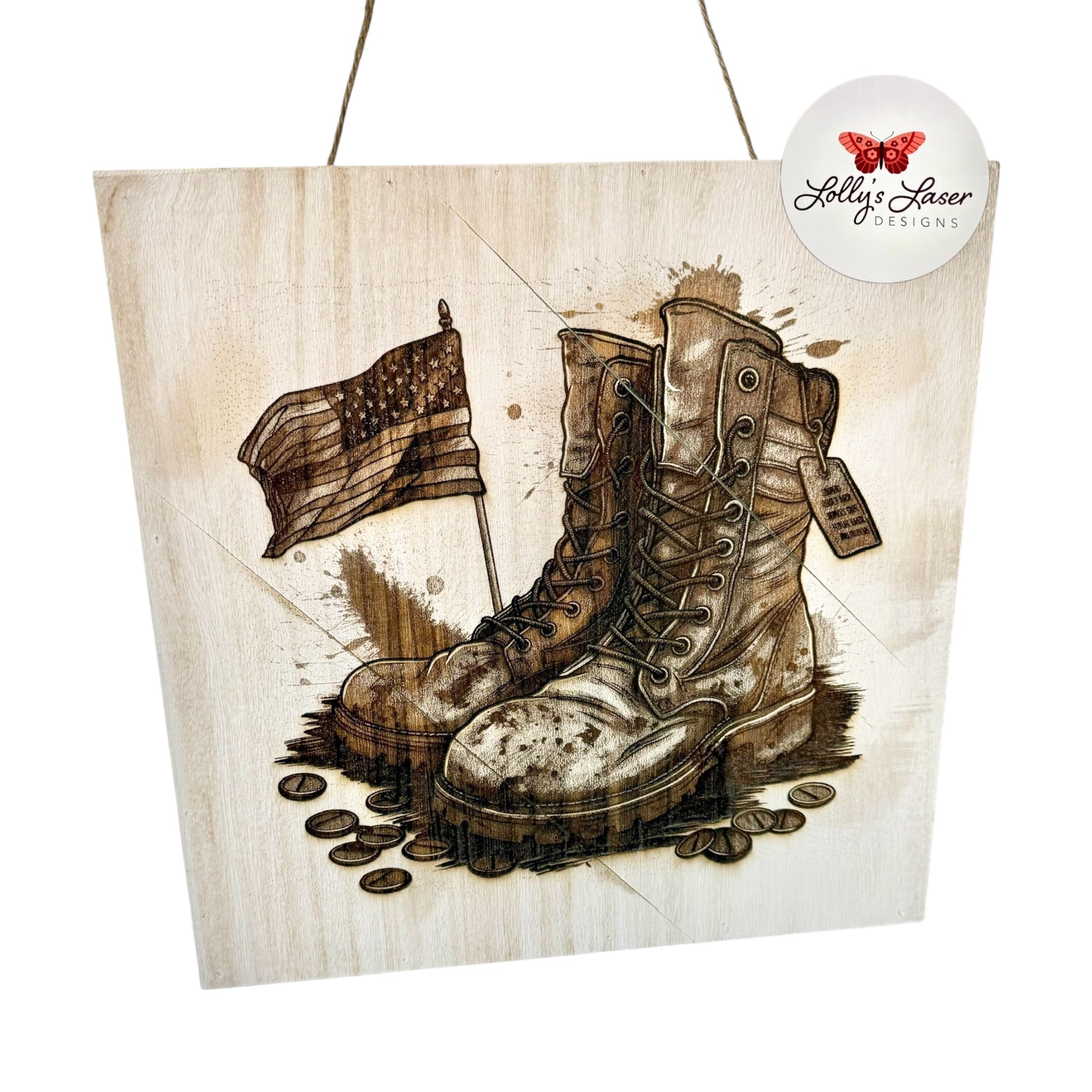 Honor the service and sacrifice of those who serve with this striking 12" x 12" laser engraved wood plank door hanger. Featuring military boots paired with an American flag and dog tags, this meaningful piece celebrates patriotism and family pride. Perfect for military families, veterans, or anyone wanting to show their support, it makes a powerful statement in any home. The precision laser engraving creates lasting detail on quality wood, ensuring this tribute endures for years. Whether displayed on a door, wall, or given as a heartfelt gift, this hanger transforms any space into a tribute to courage and dedication.