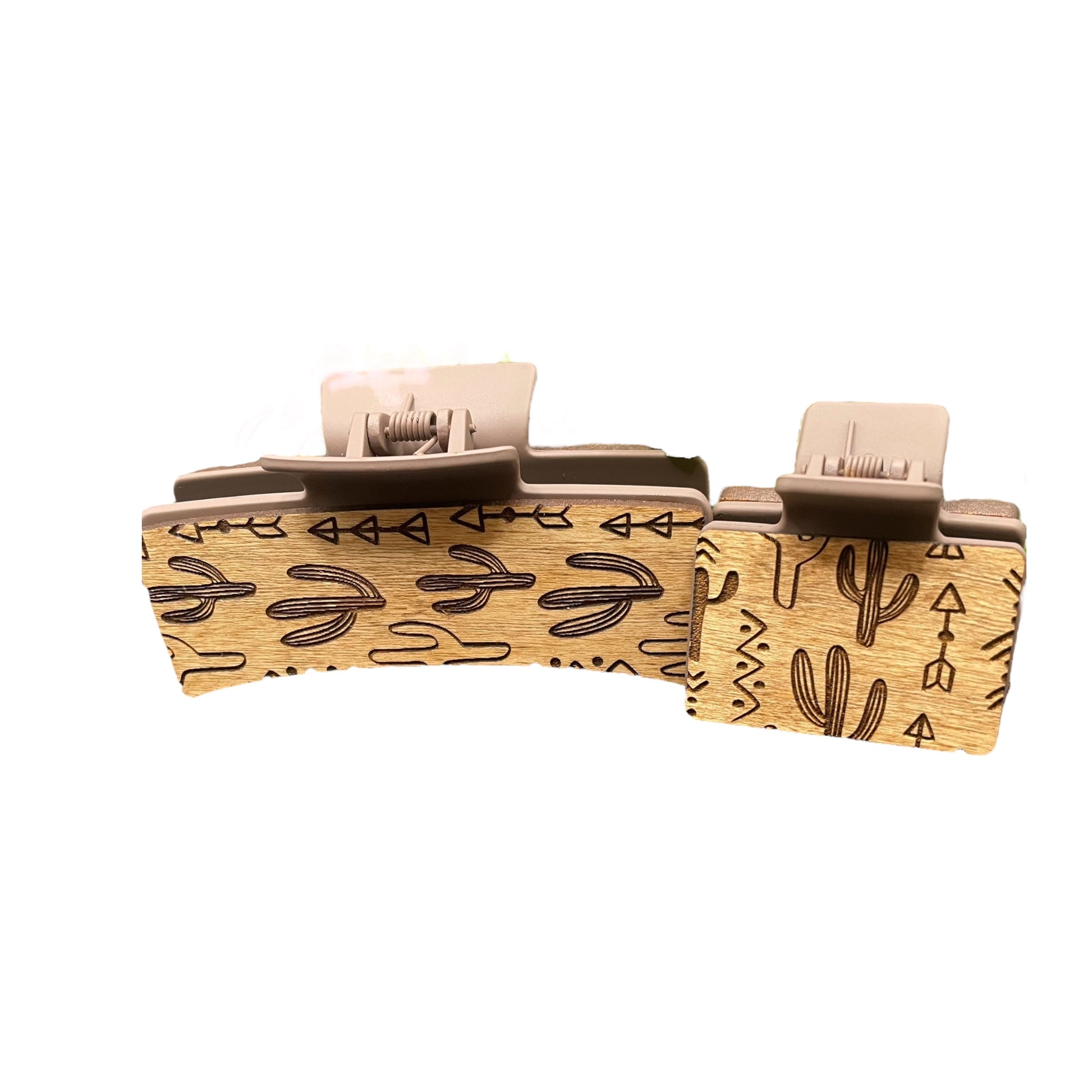Embrace southwestern style with this striking laser cut and engraved maple wood hair clip. Featuring a bold cactus and arrow design, it's crafted from natural wood that's both lightweight and durable. Choose between the 2" or 4" size to match your hair type and personal preference each sold separately. Perfect for adding a touch of desert inspired flair to any hairstyle while keeping your hair secure and stylish.