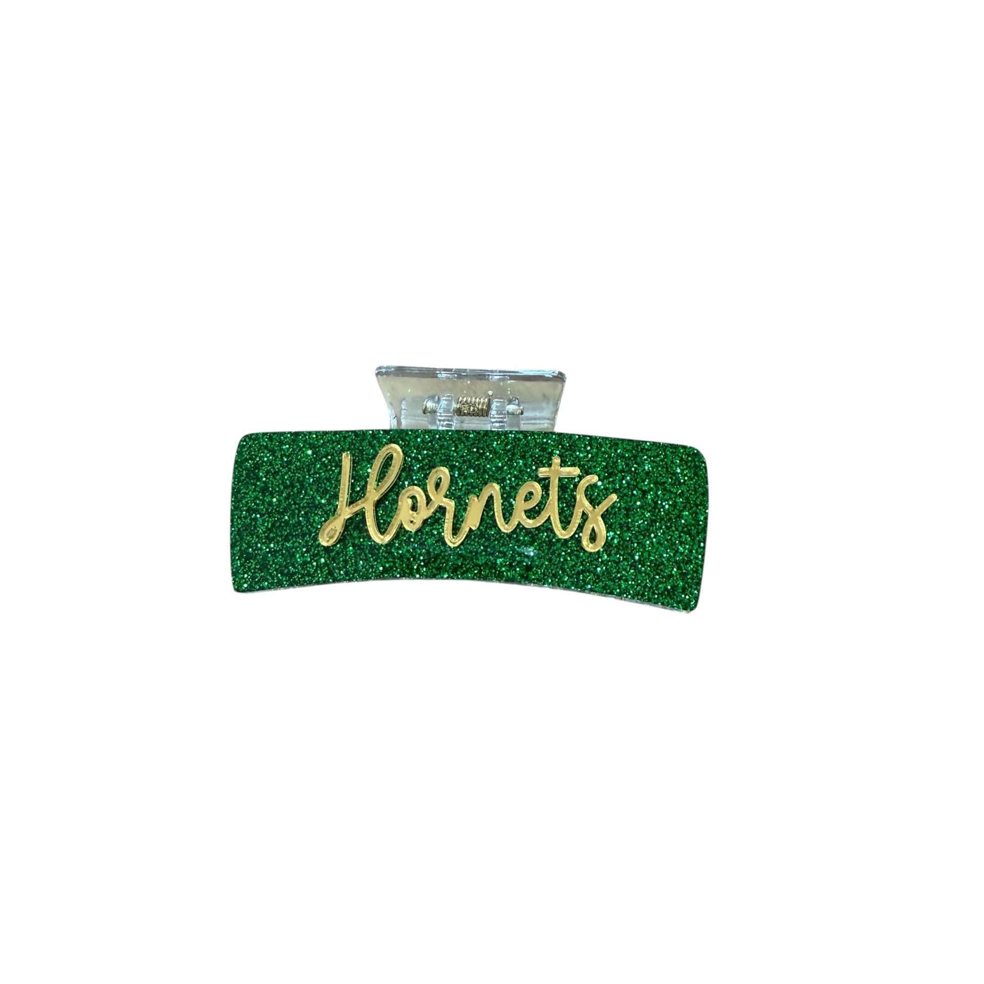 Show your team spirit with this 4" Hornets Team Hair Clip, crafted from green glitter and gold acrylic. Perfect for game day, it adds a vibrant, sparkling touch to your style while holding hair securely in place. Celebrate your favorite sport with a standout accessory that combines functionality and flair.