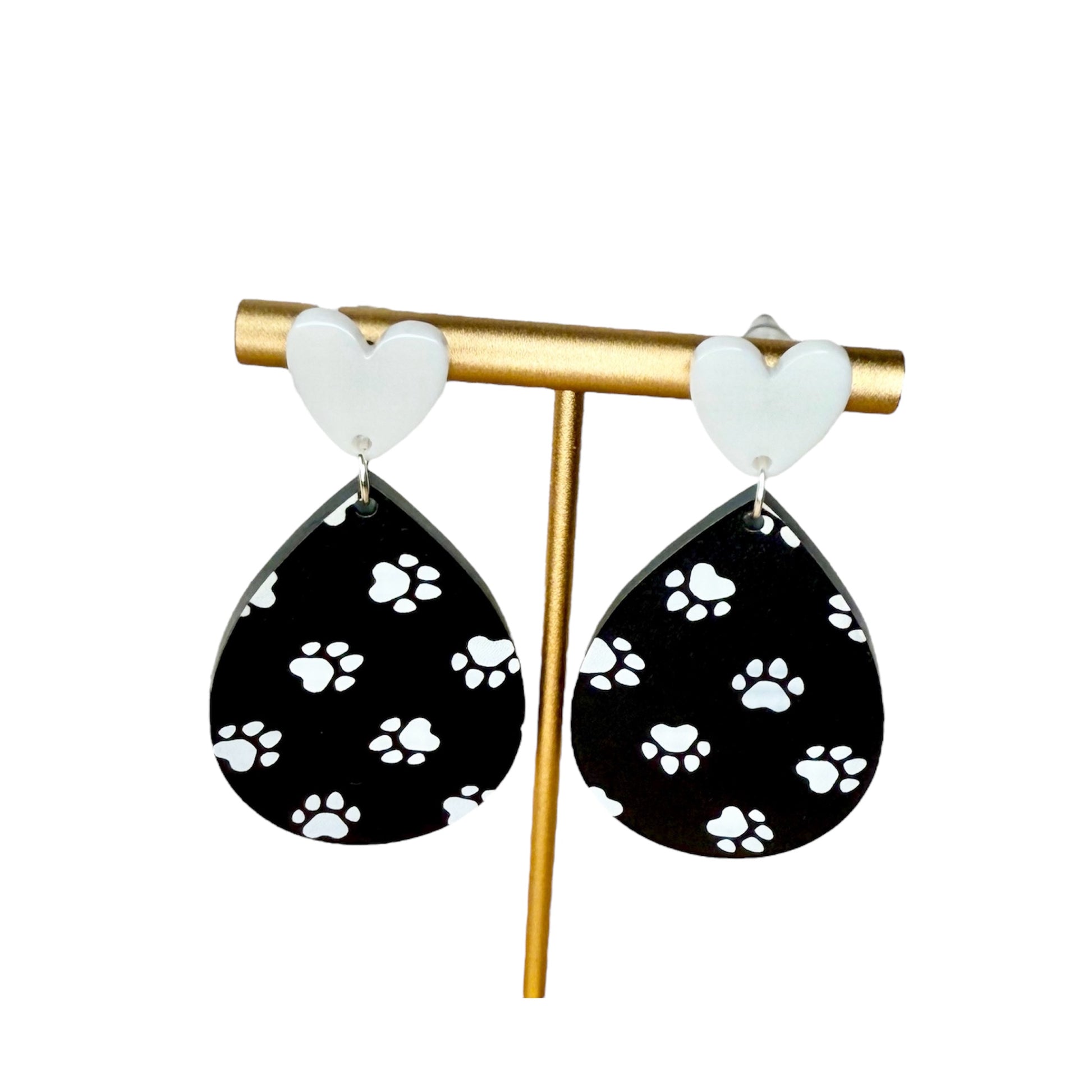Black & White Dog Paw Earring with White Heart Stud Earrings