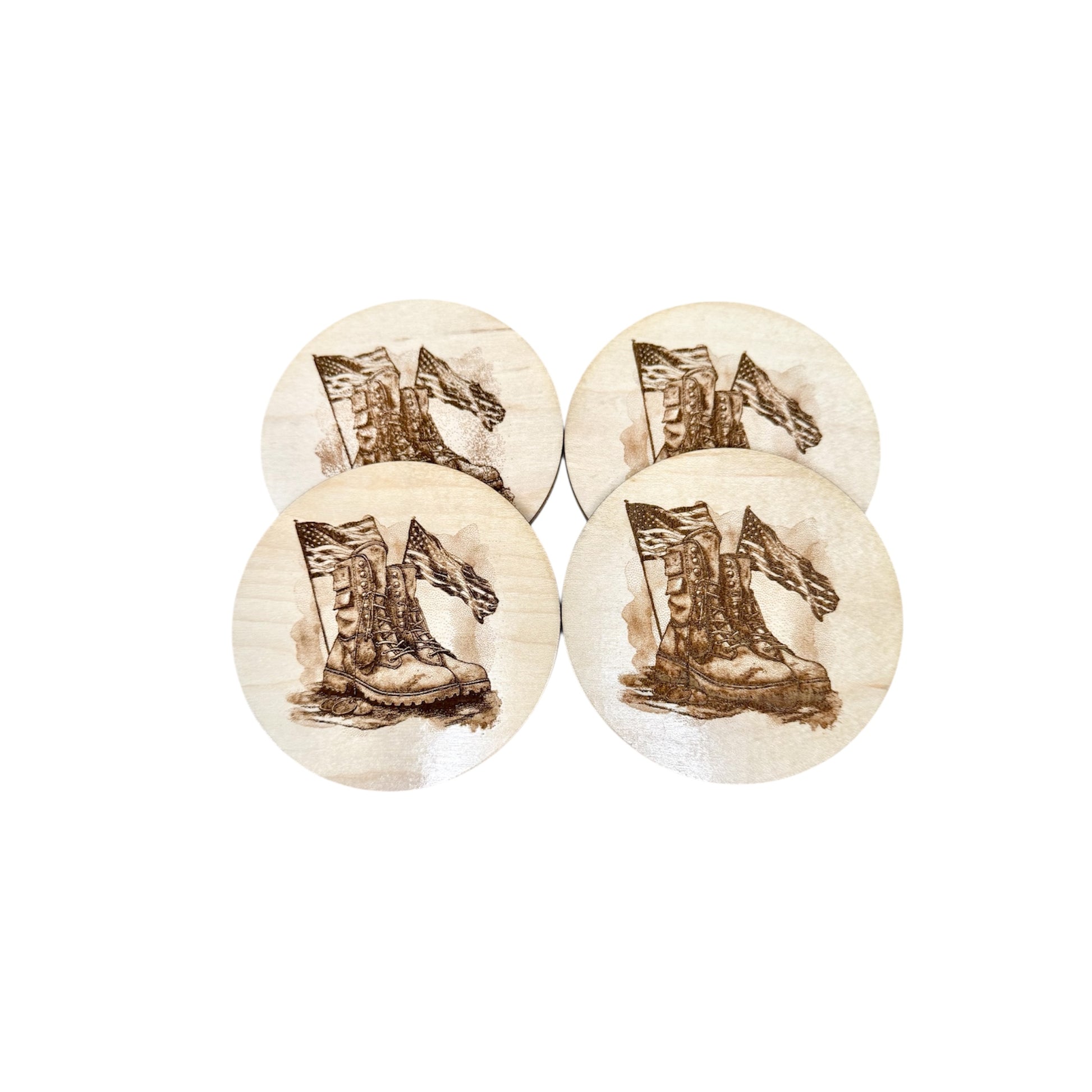 Honor service and style with this distinctive coaster set featuring laser engraved military boots and American flag imagery. Crafted from premium 1/4" maple wood and expertly stained, each of the four coasters showcases intricate detail that celebrates patriotism and pride. Perfect for veterans, active duty personnel, or anyone who values American heritage, these durable coasters protect your surfaces while making a bold statement. A meaningful gift that combines functionality with heartfelt tribute.