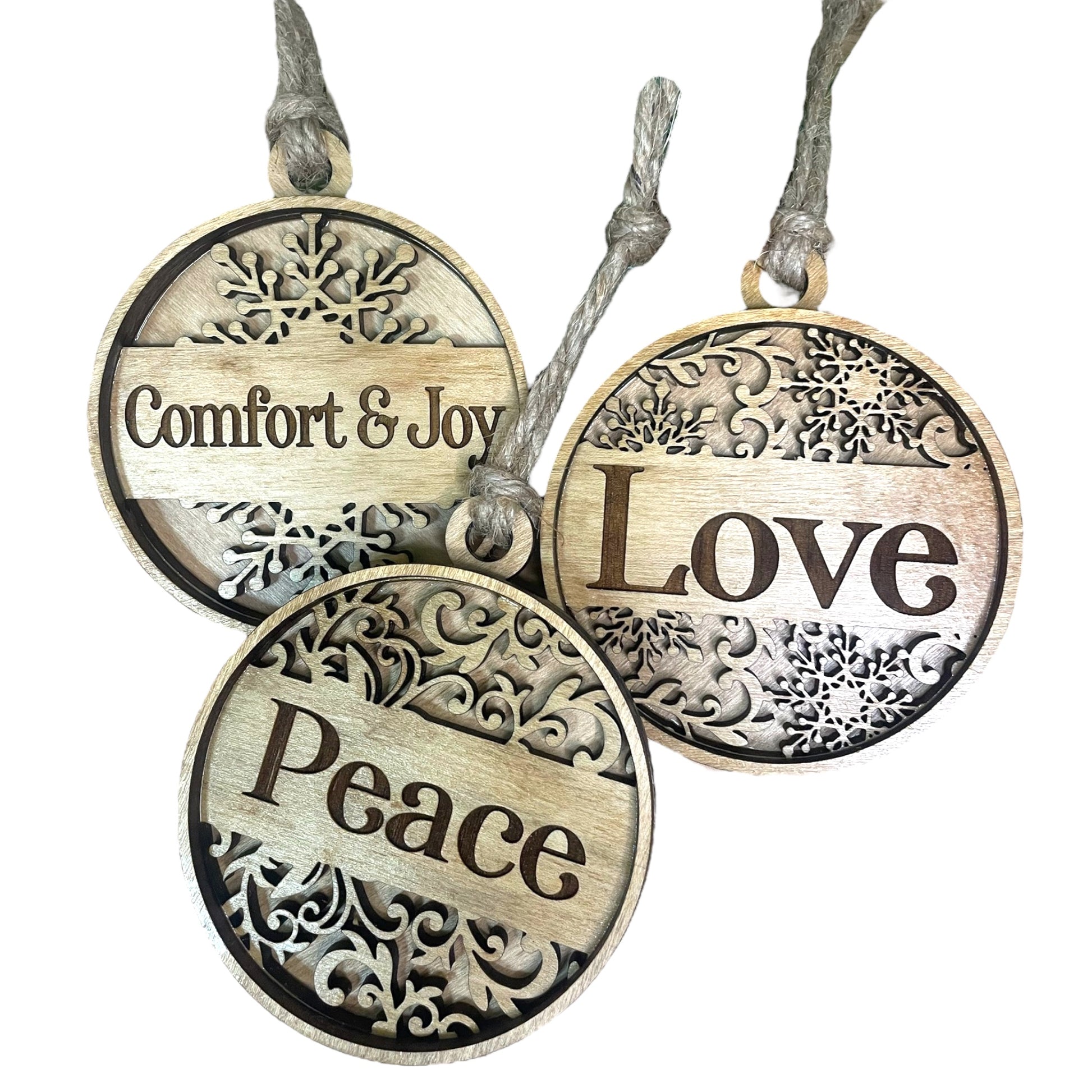 Celebrate the season with these beautifully crafted Flourish Ornaments, each one a testament to meaningful moments. Laser cut and engraved from three layers of premium 1/4" maple wood, these ornaments feature inspiring messages of peace, love, comfort, and joy. Measuring approximately 3 7/8" wide by 4 1/2" tall, they're the perfect size to display prominently on your tree or share as heartfelt gifts. The natural wood finish showcases the intricate details of each design, creating a warm, timeless addition to your holiday décor that you'll treasure for years to come.