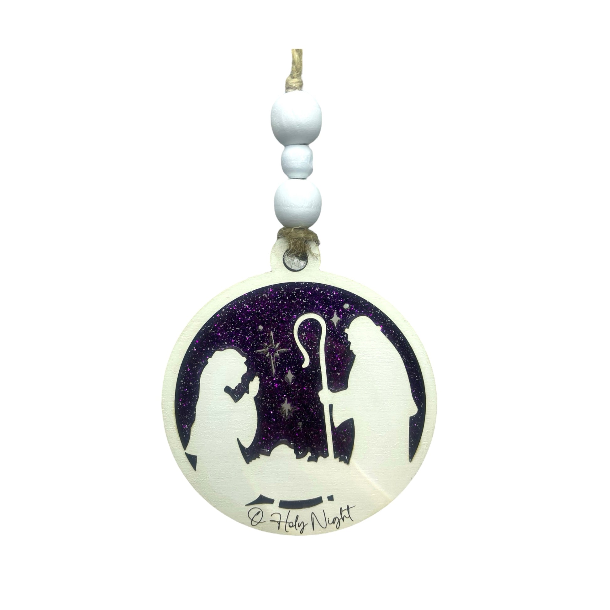 Celebrate the true meaning of Christmas with this stunning O Holy Night Nativity ornament. Expertly laserccut in two layers, it features vibrant purple glitter acrylic paired with beautifully painted maple wood for a dimensional, eye catching design. Three decorative beads and a rustic jute hanger make it ready to display on your tree. A meaningful addition to your holiday collection that honors the nativity story with elegance and charm.