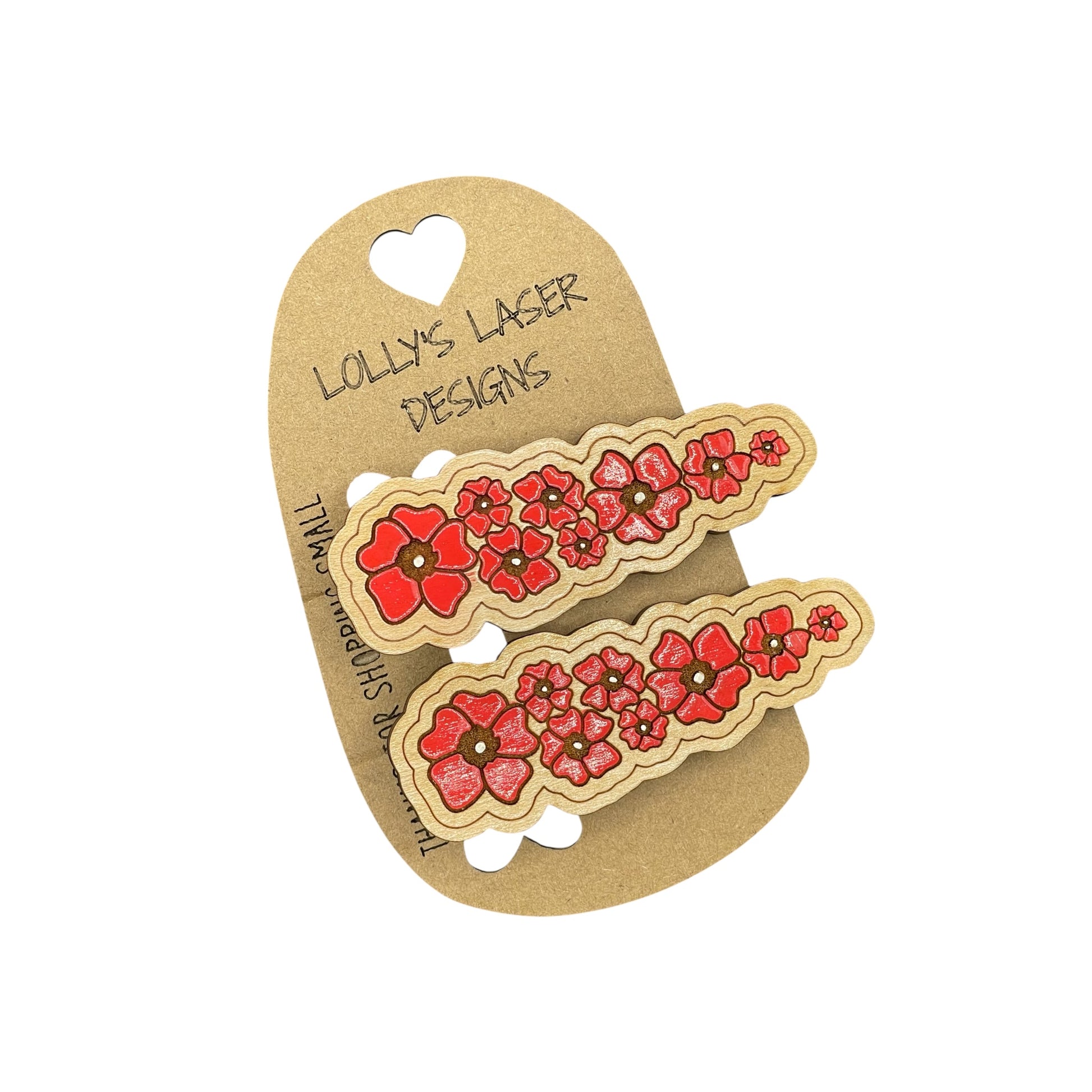These charming hair barrettes combine natural beauty with thoughtful craftsmanship. Each piece features laser-cut and engraved maple wood adorned with delicate hand-painted poppy seed flower details. The sturdy alligator clips provide a reliable, secure hold throughout your day, keeping your hair styled just right. This set of two gives you versatile options for any occasion. Perfect for anyone who appreciates handmade accessories that celebrate nature's elegance.