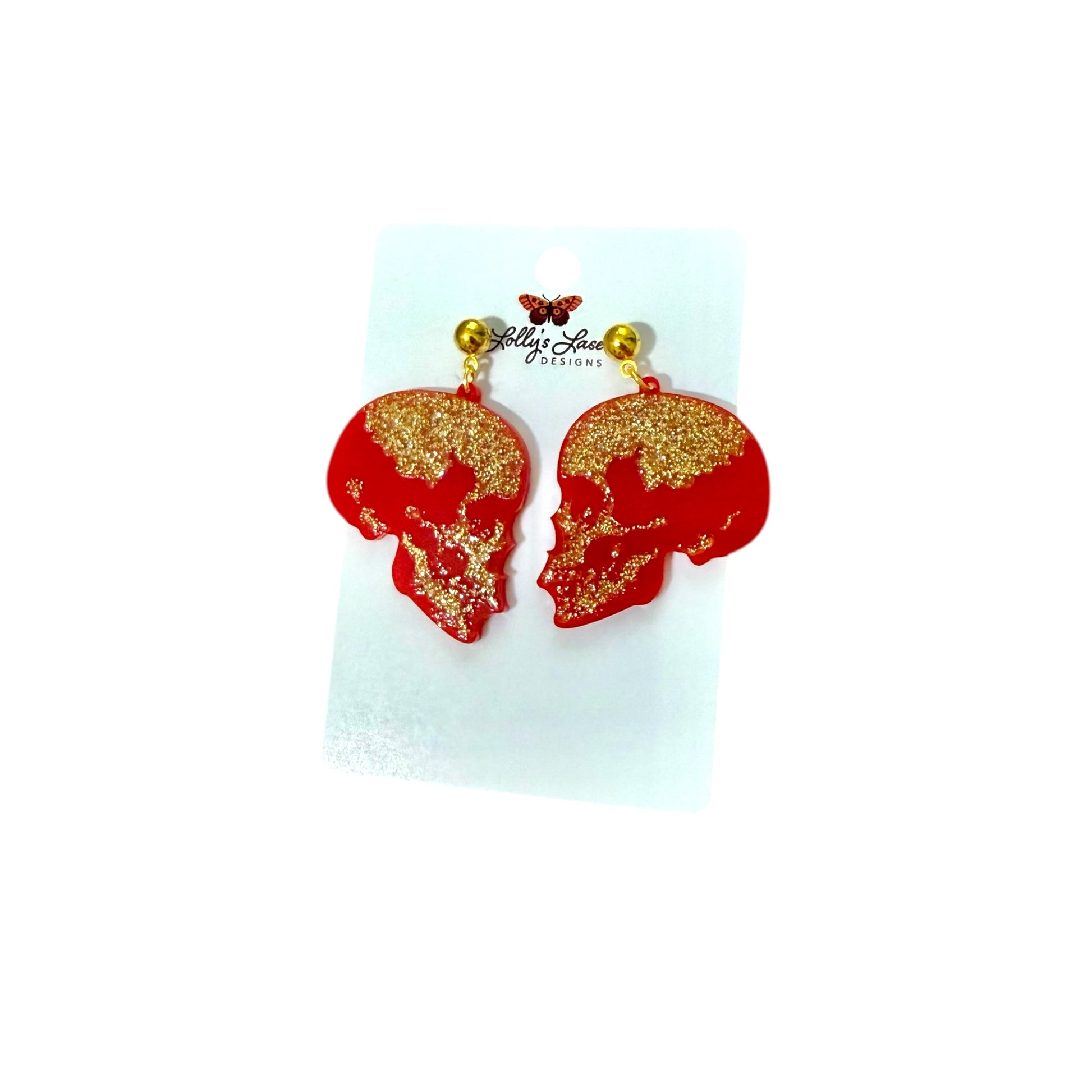 Elevate your style with the striking Red & Gold Skull Earrings! Crafted from laser cut acrylic and filled with rich resin, these earrings are not just accessories they're a bold statement of individuality and support. The elegant gold studs enhance the design, making them perfect for any occasion!